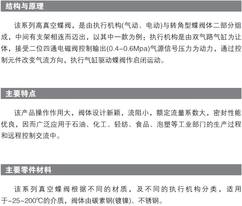 该系列高真空蝶阀,是气动单元组合仪表中的执行单元,它来自调节仪表的信号,改变介质的切断与流通,该产品操作作用大,阀体设计新颖,流阻小,额定流量系数大,密封性能优良,因而广泛应用于石油、化工、轻纺、食品、泡塑等个工业部门的生产过程自动控制和远程控制交流中。